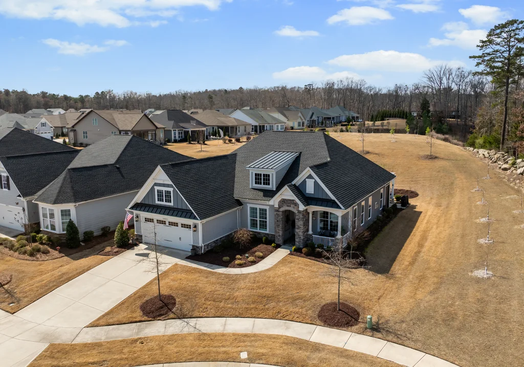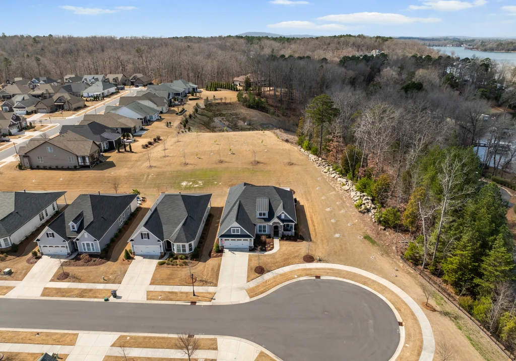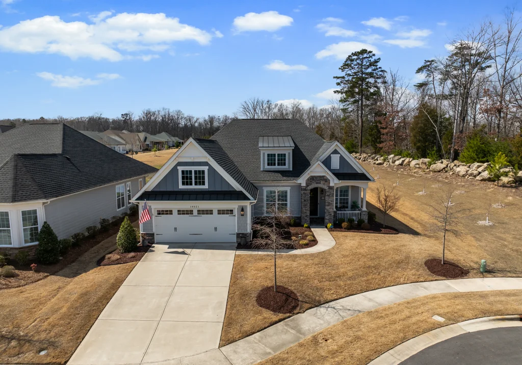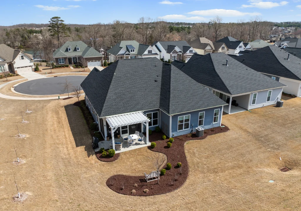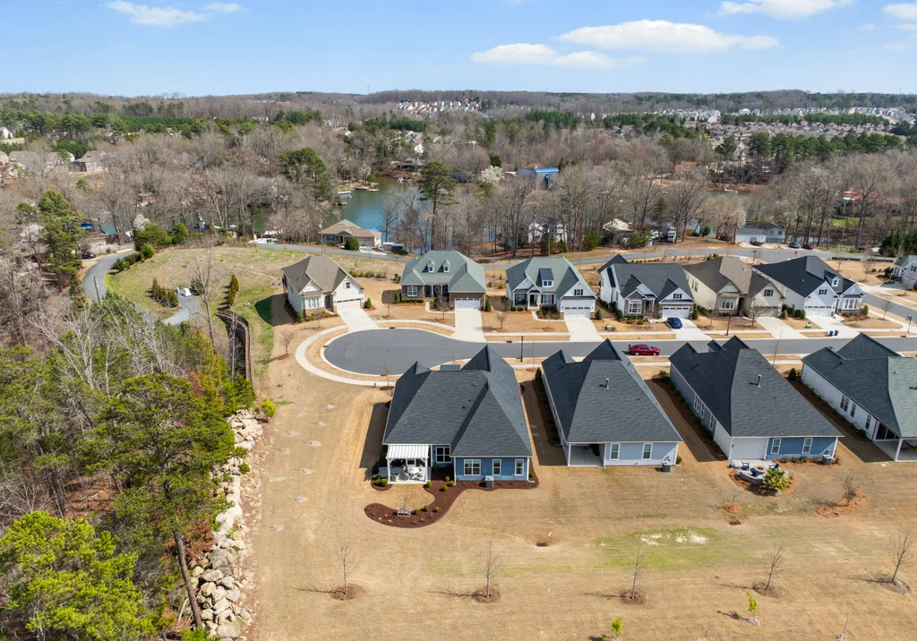 Located in the Regency at Palisades near Lake Wylie, this 2020 Toll Brothers built single level residence offers 2,300 sq. ft. of curated design and functional elegance on a 0.19 acre cul-de-sac homesite. Seasonal peek-a-boo views of Lake Wylie can be enjoyed from the front yard, with lake access, marinas and outdoor recreation just minutes away. The interior reflects a professionally curated aesthetic with layered textures and cohesive designer selections throughout. Engineered hardwood flooring spans the main living areas, complemented by upgraded lighting fixtures and custom wallpaper installations that create visual continuity from room to room. The open concept great room/family room centers around a gas fireplace and transitions seamlessly into the chef’s kitchen. An expansive center island with quartz countertops, KitchenAid appliances, a gas range and wall oven with integrated microwave anchor the space, while custom pantry cabinetry enhances organization. The kitchen overlooks the living area, supporting both everyday living and entertaining. Just off the eat-in kitchen, a private office provides a dedicated work-from-home environment with views of the backyard, offering both functionality and separation from the main living areas. Multi-sliding glass doors extend the interior to a screened sun porch with ceiling fan, creating a true indoor-outdoor living experience. An additional patio extends beyond the screened porch provides expanded entertaining space and overlooks a private backyard setting. The primary suite features a tray ceiling, custom window shades and backyard views. The spa-style bath includes a double vanity with seated vanity station, an oversized walk-in shower and custom built-in shelving within the primary closet. Ceiling speakers, ceiling fans and custom closet build-outs further elevate functionality. Every finish has been intentionally selected to create a refined yet livable environment. The two-car garage provides practical storage and an additional 300 sq. ft. of attic space. The neighborhood offers a lifestyle centered around recreation and community, with amenities including a resort style clubhouse with bocce ball, tennis courts, swimming and activities. Landscape maintenance is included by HOA (see CC&R's). Conveniently located near Lake Wylie and within easy reach of Charlotte’s shopping, dining, and golf. This home offers design-forward living in an established community. 25-30 min to Charlotte Douglas Airport, 25-30 Min to the heart of Uptown Charlotte (Center City), 10 min to McDowell Nature Preserves (Hiking/Kayaking) and 10-15 min to Daniel Stowe Botanical Gardens.