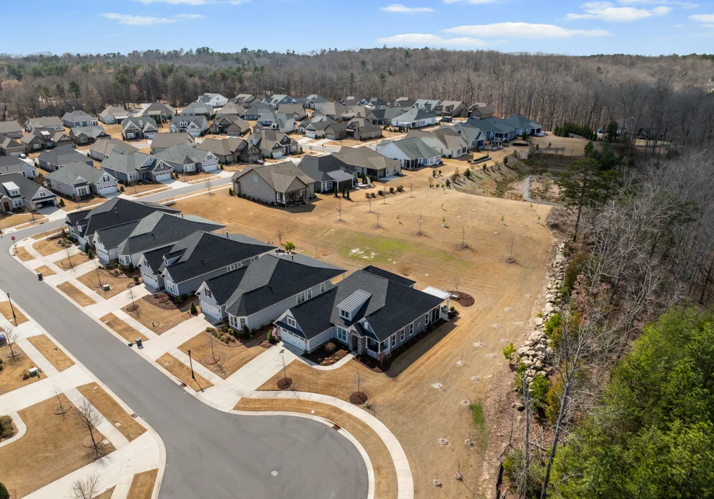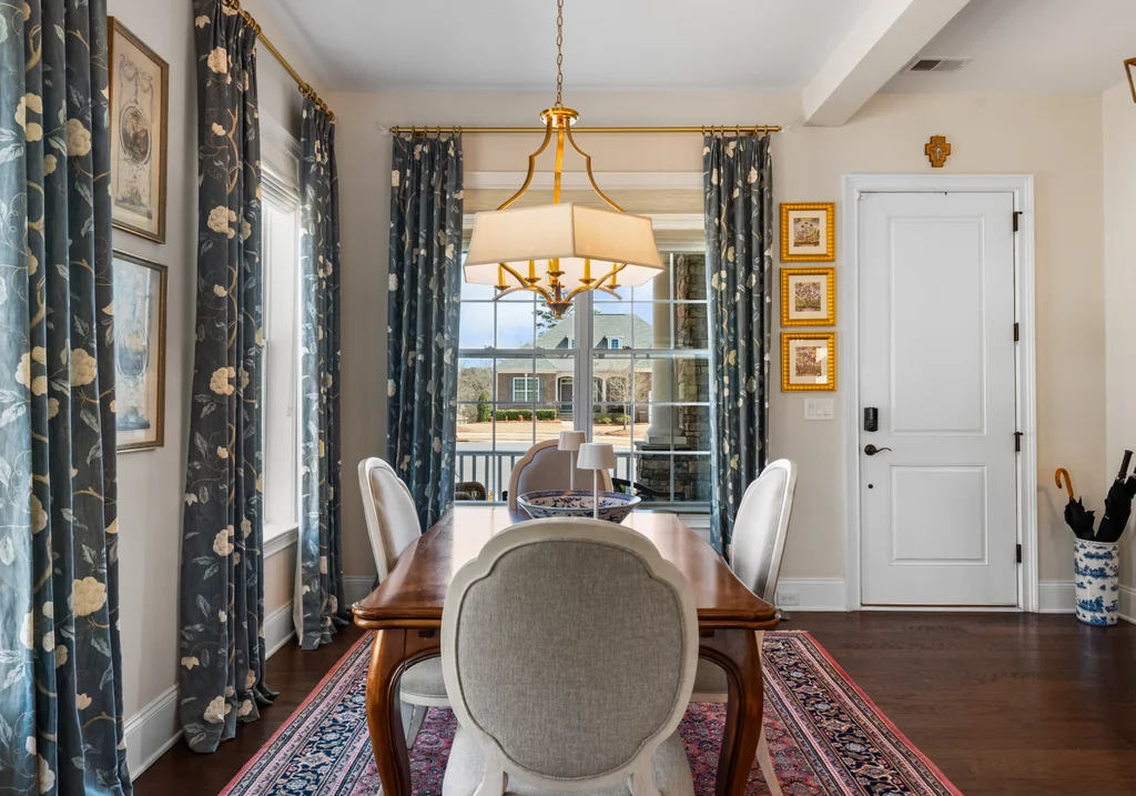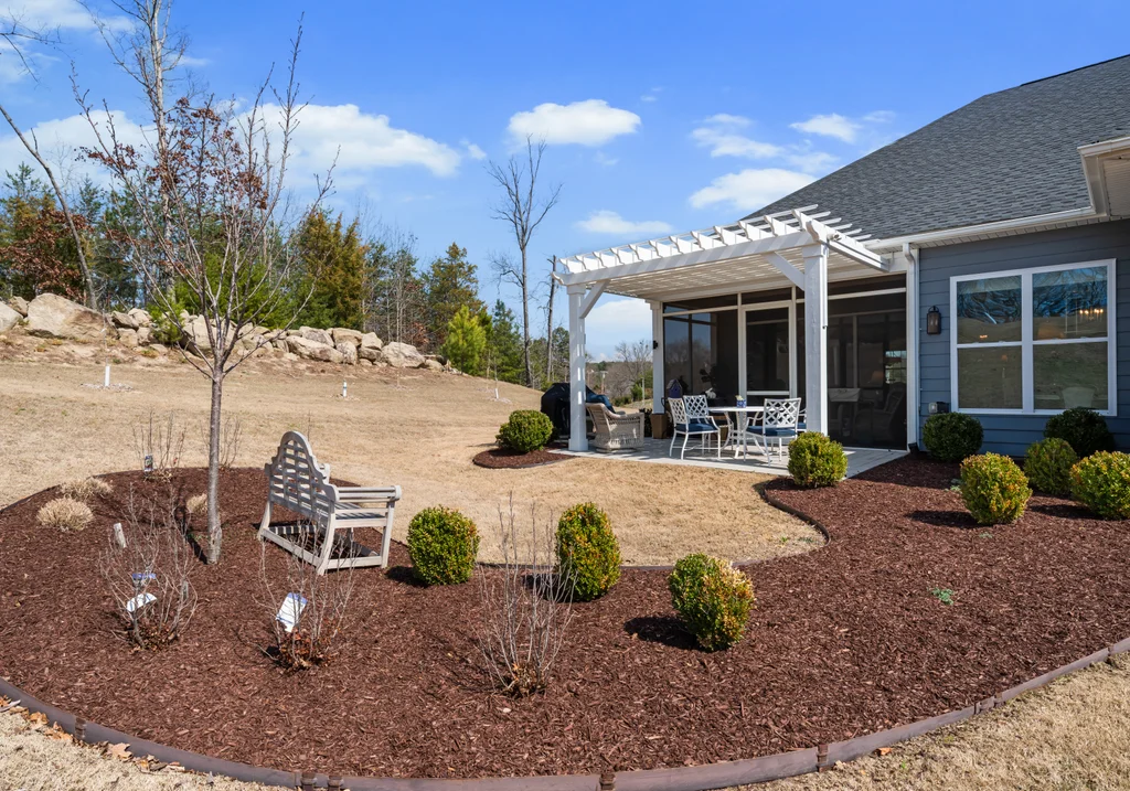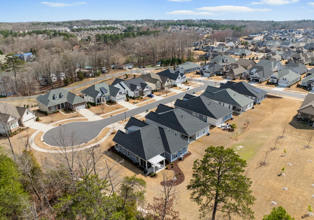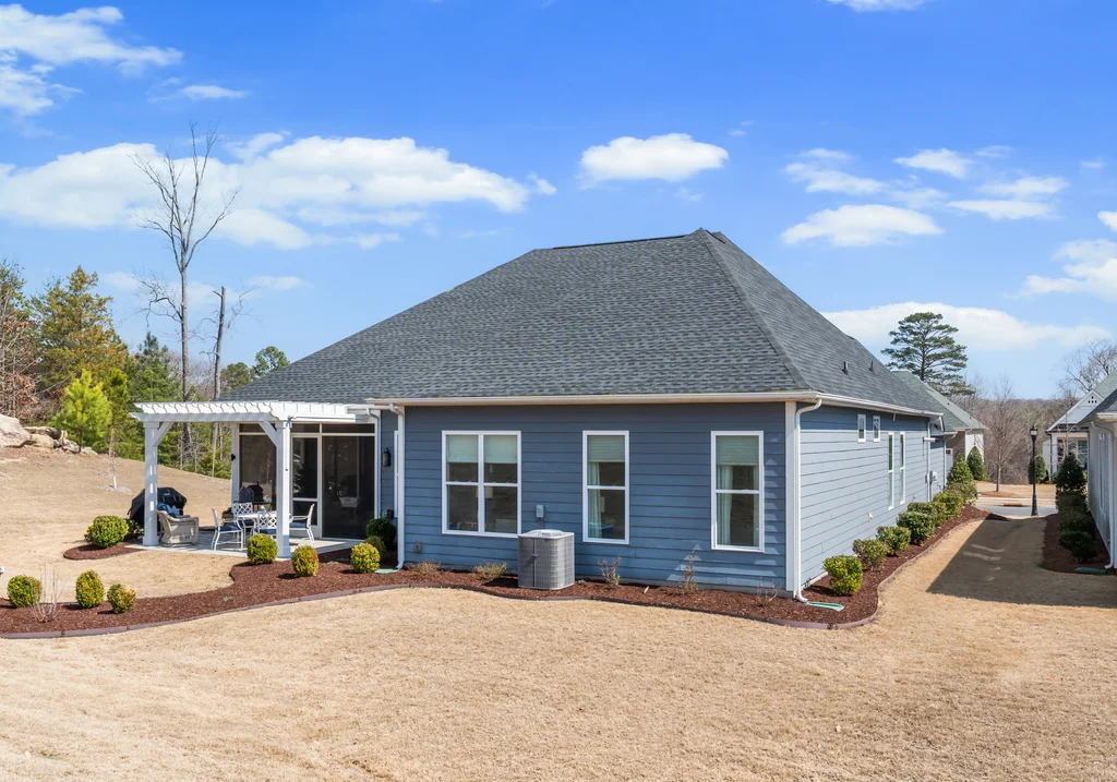 Located in the Regency at Palisades near Lake Wylie, this 2020 Toll Brothers built single level residence offers 2,300 sq. ft. of curated design and functional elegance on a 0.19 acre cul-de-sac homesite. Seasonal peek-a-boo views of Lake Wylie can be enjoyed from the front yard, with lake access, marinas and outdoor recreation just minutes away. The interior reflects a professionally curated aesthetic with layered textures and cohesive designer selections throughout. Engineered hardwood flooring spans the main living areas, complemented by upgraded lighting fixtures and custom wallpaper installations that create visual continuity from room to room. The open concept great room/family room centers around a gas fireplace and transitions seamlessly into the chef’s kitchen. An expansive center island with quartz countertops, KitchenAid appliances, a gas range and wall oven with integrated microwave anchor the space, while custom pantry cabinetry enhances organization. The kitchen overlooks the living area, supporting both everyday living and entertaining. Just off the eat-in kitchen, a private office provides a dedicated work-from-home environment with views of the backyard, offering both functionality and separation from the main living areas. Multi-sliding glass doors extend the interior to a screened sun porch with ceiling fan, creating a true indoor-outdoor living experience. An additional patio extends beyond the screened porch provides expanded entertaining space and overlooks a private backyard setting. The primary suite features a tray ceiling, custom window shades and backyard views. The spa-style bath includes a double vanity with seated vanity station, an oversized walk-in shower and custom built-in shelving within the primary closet. Ceiling speakers, ceiling fans and custom closet build-outs further elevate functionality. Every finish has been intentionally selected to create a refined yet livable environment. The two-car garage provides practical storage and an additional 300 sq. ft. of attic space. The neighborhood offers a lifestyle centered around recreation and community, with amenities including a resort style clubhouse with bocce ball, tennis courts, swimming and activities. Landscape maintenance is included by HOA (see CC&R's). Conveniently located near Lake Wylie and within easy reach of Charlotte’s shopping, dining, and golf. This home offers design-forward living in an established community. 25-30 min to Charlotte Douglas Airport, 25-30 Min to the heart of Uptown Charlotte (Center City), 10 min to McDowell Nature Preserves (Hiking/Kayaking) and 10-15 min to Daniel Stowe Botanical Gardens.