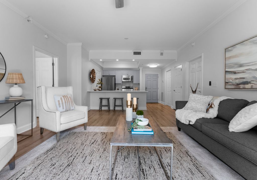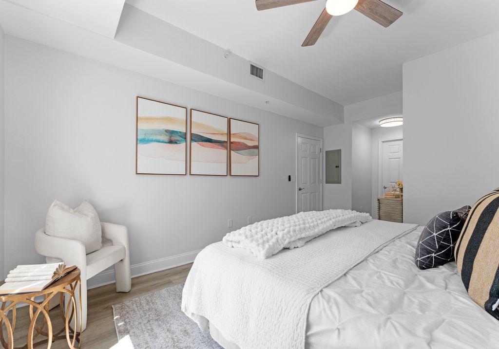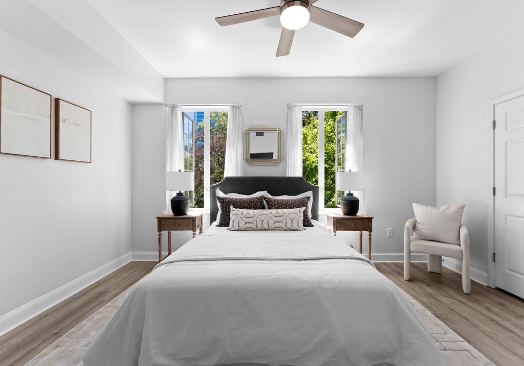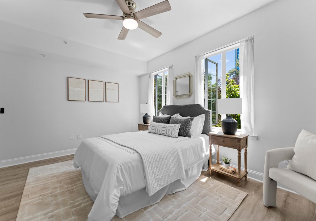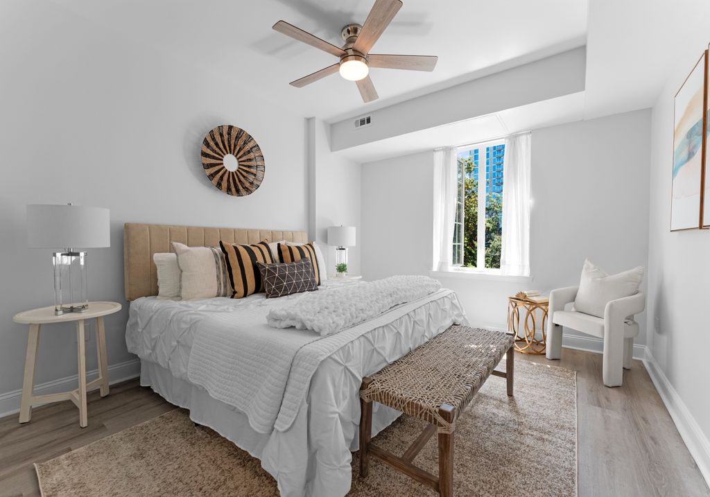 This 2 bed 2 bath updated split layout home at sought after 5th and Poplar, has been virtually staged for today's lifestyle. Though compact in size at 1029 square feet, the open concept kitchen/ living /dining area can accommodate a number of guests. The second bedroom has been staged as TV room/office. This light filled airy living space extends through sliding glass doors to the balcony that is perched above historic tree canopied Settler's Park. The perfect spot to enjoy your morning coffee, check your emails, or unwind at days end!