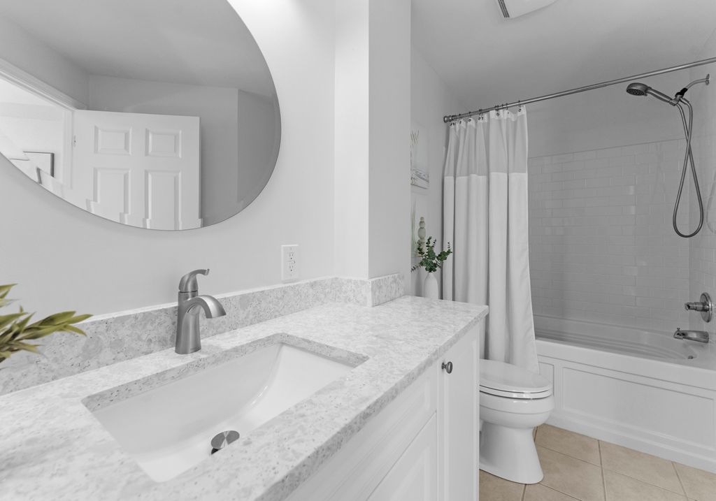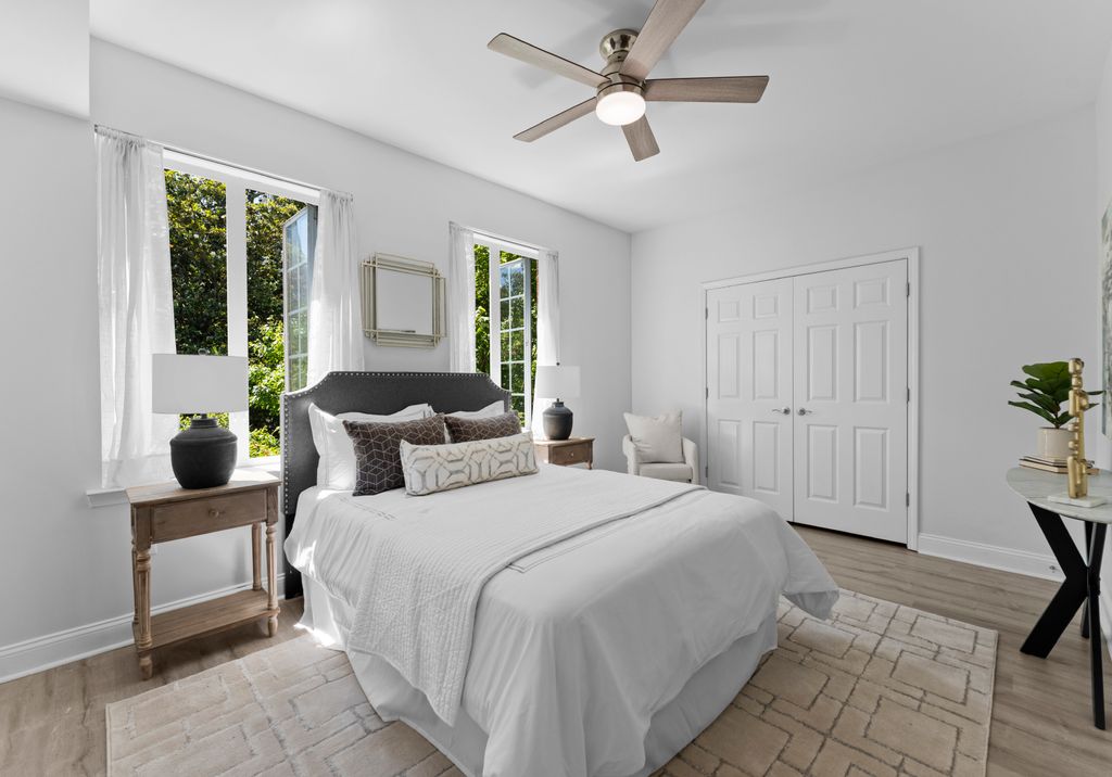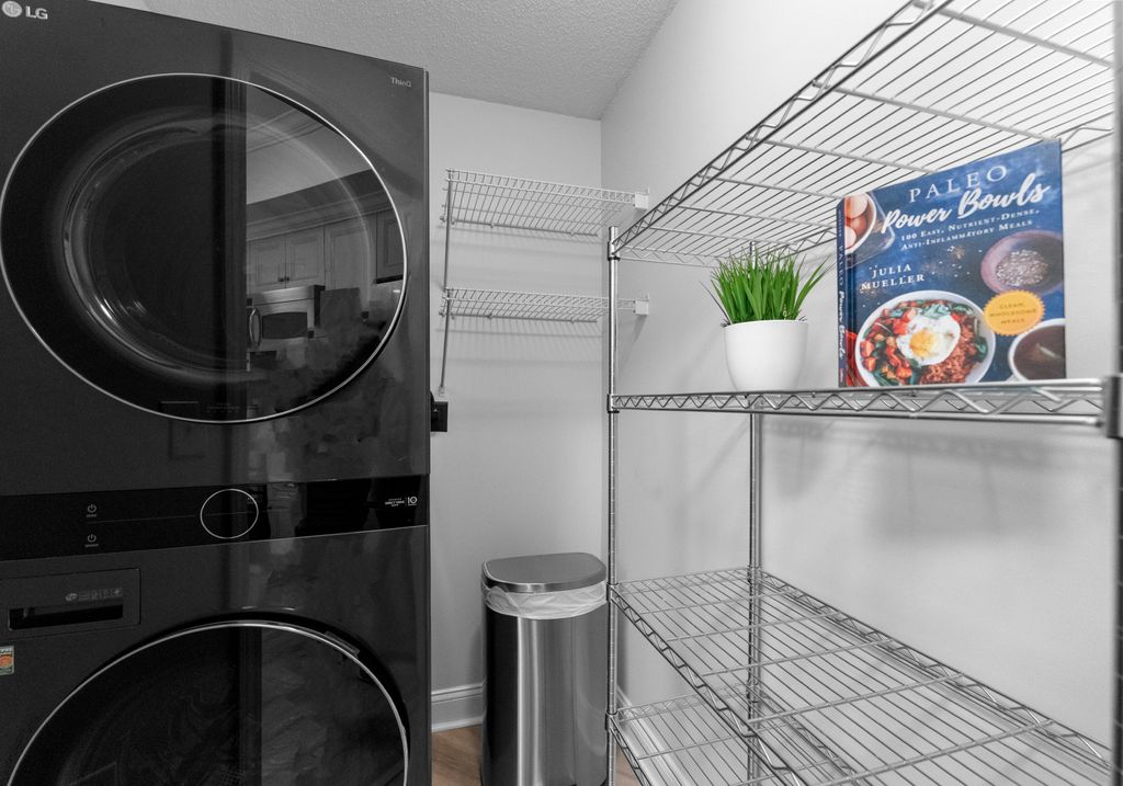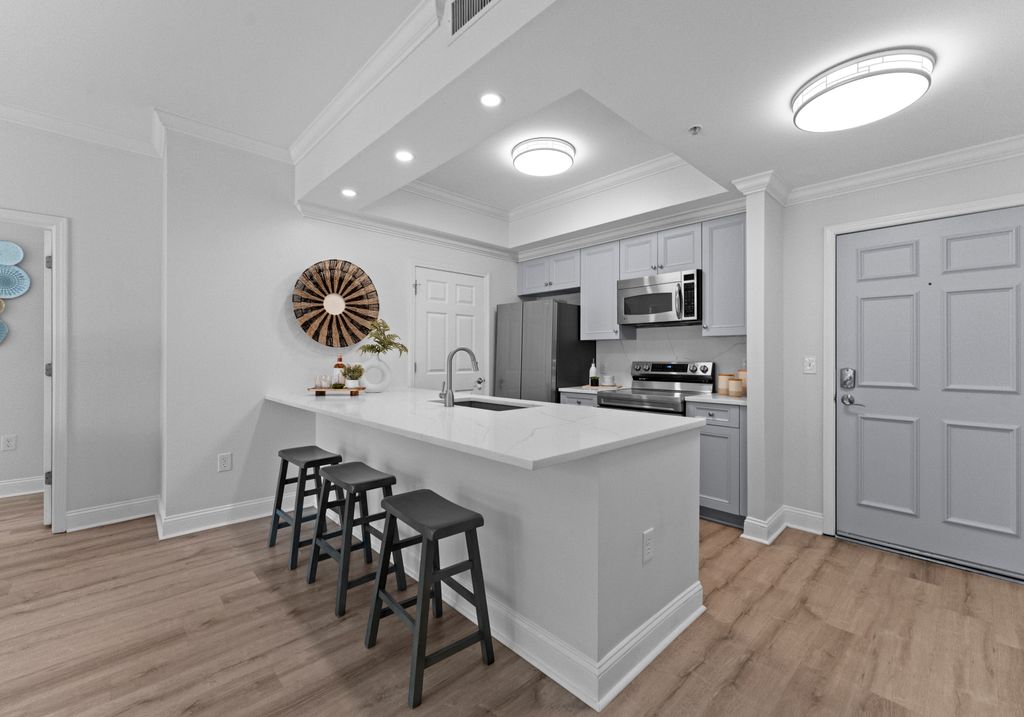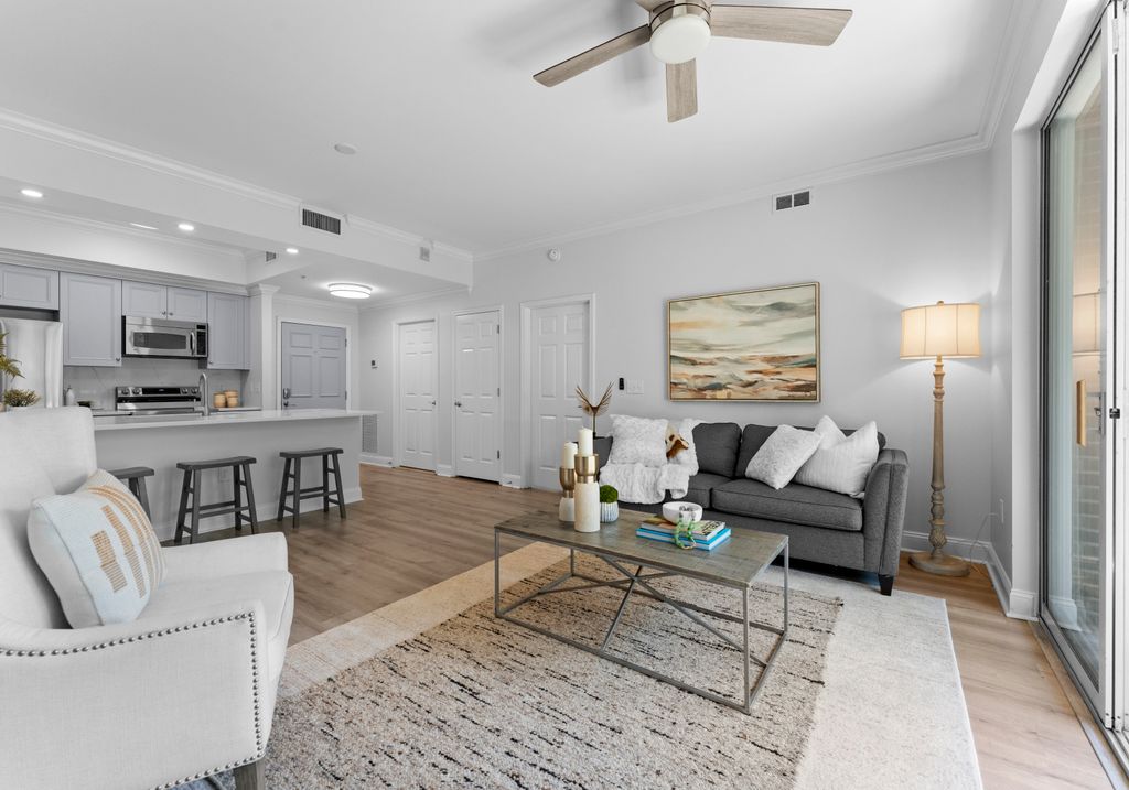 The original bar height counter has been lowered and expanded. The tasteful quartz countertop island anchors kitchen/great room. New Samsung & LG appliances, quartz sink, ceiling fans & lighting. Walk in pantry/laundry with new stackable LG washer/dryer. Baths w new quartz countertops. Elegant neutral toned LVP throughout. Secure deeded parking. Meticulous homeowners replaced water tank & HVAC condenser, window hardware, sliding door rollers & hardware. New roof 2023, hall carpet & paint 2022. No planned assessments.